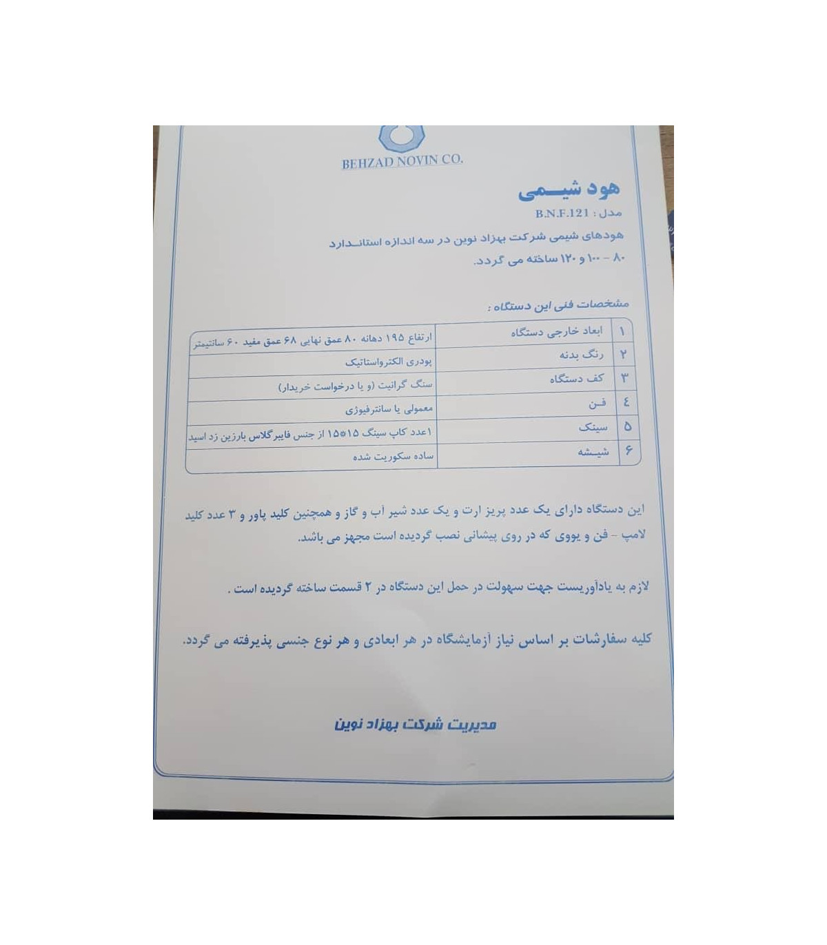 هودهای شیمی شرکت بهزاد نوین در سه اندازه ی استاندارد عرض 150 ساخته میگردد . این دستگاه دارای یک عدد پریزارت و یک عدد شیر اب و گاز و همچنین کلید پاور وسه عدد کلید لامپ - فن و یووی که در پیشانی نصب گردیده است مجهز میباشد . جهت سهولت در حمل این دستگاه دردو قسمت ساخته گردیده است . کلیه ی سفارشات بر اساس نیاز ازمایشگاه در هر ابعادی و هر جنسی پذیرفته می شود . مشخصات فنی دستگاه: . ابعاد خارجی دستگاه:ارتفاع 195دهانه80 عمق نهایی68عمق مفید60 سانتی متر . رنگ بدنه:پودری الکترواستاتیک . کف دستگاه:سنگ گرانیت(ویا درخواست خریدار) . فن:معمولی یا سانترفیوژی . سینک:1عدد کاپ سینگ15*15از جنس فایبر گلاس با رزین زد اسید . شیشه:ساده سکوریت شده
