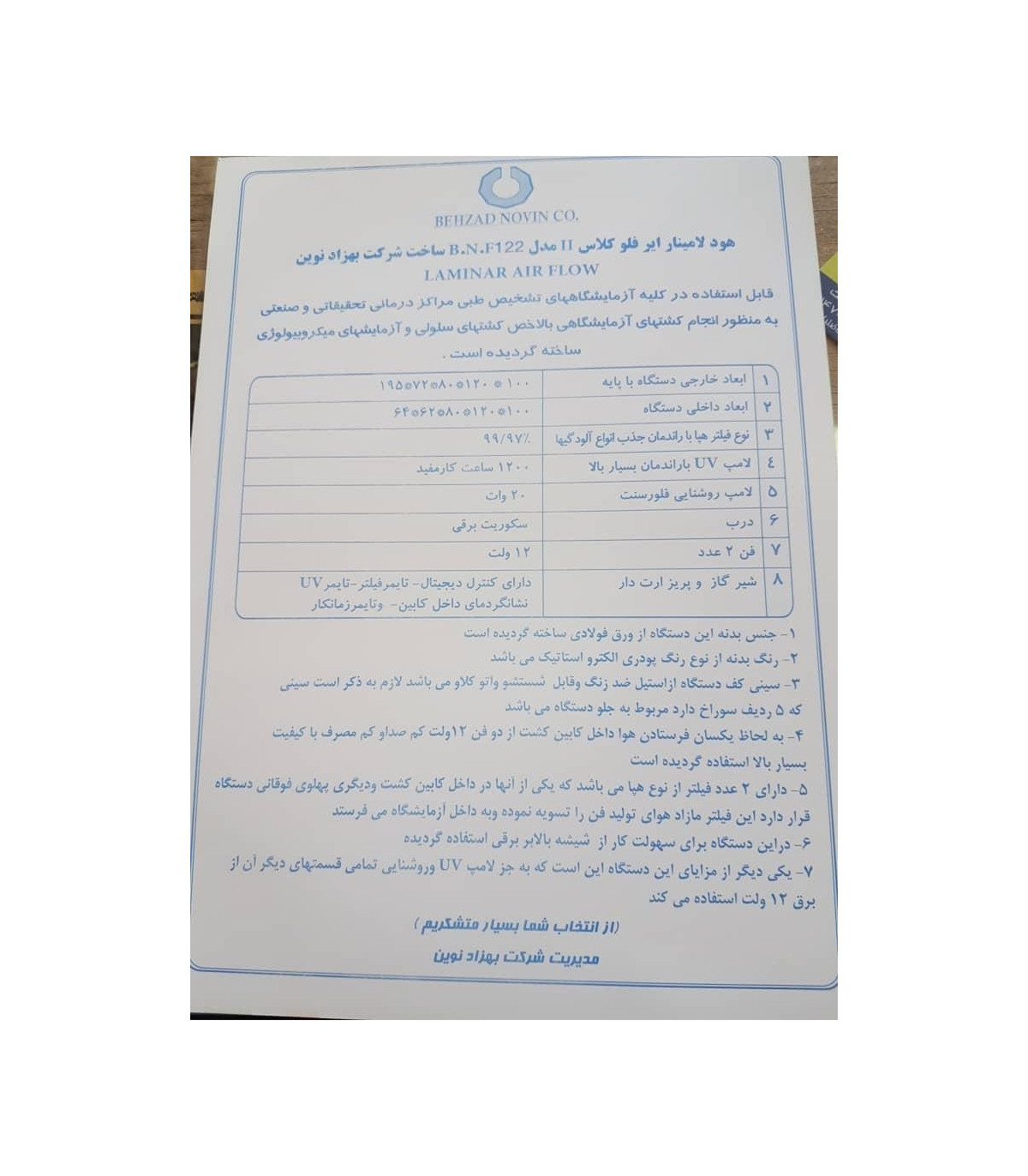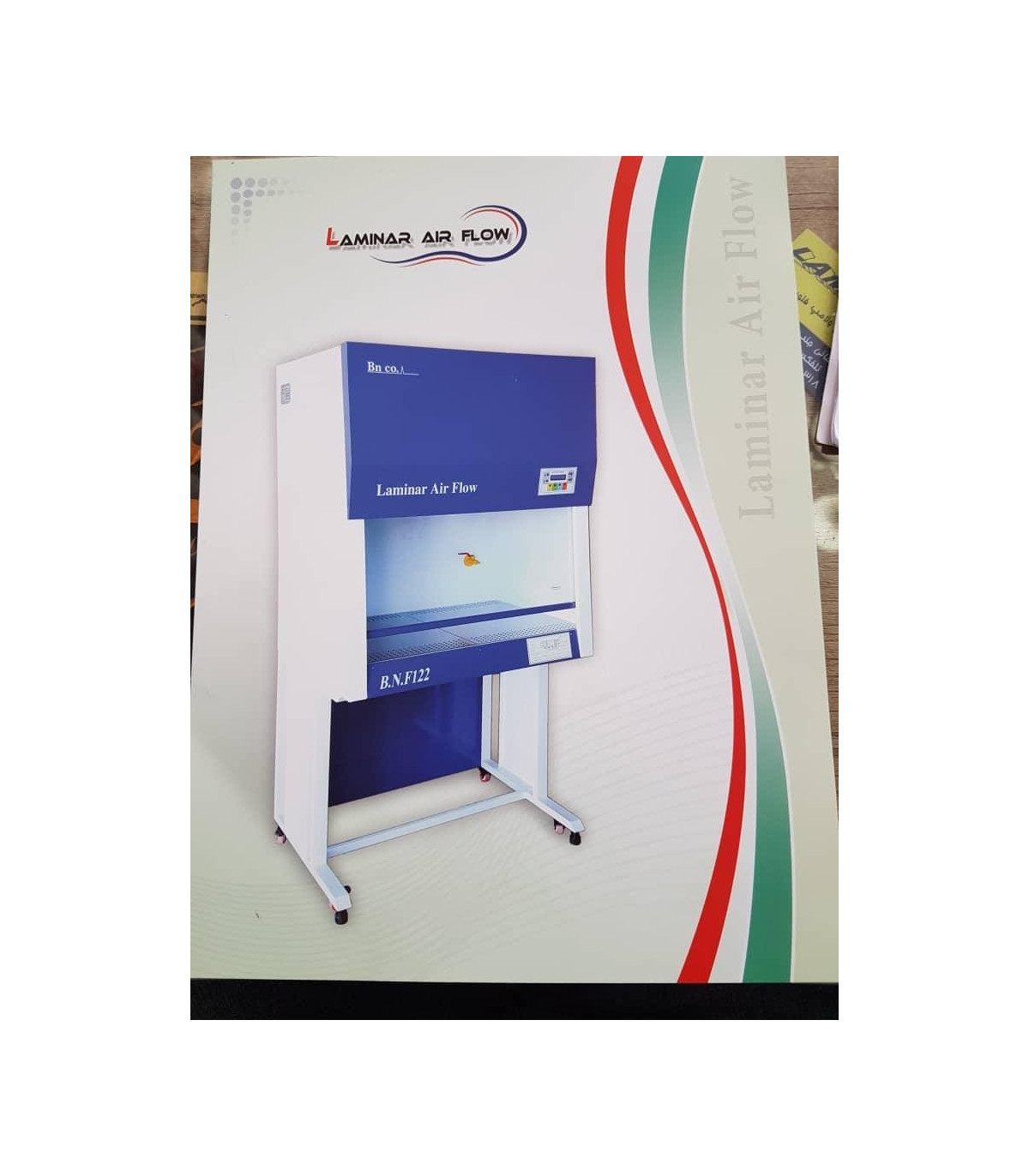 هود لامینار ایر فلو کلاس مدل B.N.F122ساخت شرکت بهزاد نوین . قابل استفاده در کلیه ی ازمایشگاه های طبی مراکز درمانی تحقیقاتی و صنعتی به منظورانجام کشت های ازمایشگاهی بالاخص کشت های سلولی و ازمایشگاهای میکروبیولوژی ساخته گردیده است . جنس بدنه ی این دستگاه از ورق فولادی ساخته گردیده است .رنگ بدنه از نوع پودری الکترواستاتیک است .سینی کف دستگاه از استیل ضد رنگ و قابل شستشو واتو کلاو می باشد . به لحاظ یکسان فرستادن هوا داخل کابین کشت از دو فن 12ولت کم صدا و کم مصرف با کیفیت بسیار بالا استفاده گردیده است . دارای 2عدد فیلتر از نوع هپا میباشد که یکی از انها در داخل کابین کشت و دیگری پهلوی فوقانی دستگاه قرار دارد این فیلتر مازاد هوای تولید فن را تسویه نموده و به داخل ازمایشگاه می فرستد . در این دستگاه برای سهولت کار از شیشه ی بالا بر برقی استفاده گردیده .به جز لامپ UV و روشنایی تمامی قسمت های دیگر آن از برق 12ولت استفاده گردیده . ابعاد خارجی دستگاه با پایه :100*120*80*عرص دستگاه